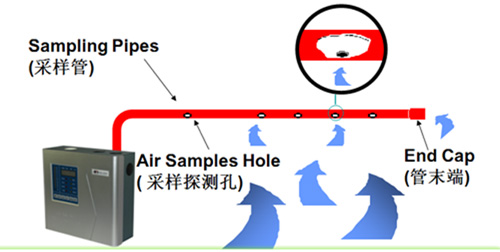 吸气式感烟火灾探测器跟传统的(点型)烟雾探测器有所不同。空气采样系统由在天花板上方或下方每隔几米平行安装的管道组成。在每根管子的上面,每隔几米就钻有一个小孔,这些小孔很均匀的在天花板上分布,这样就形成了一组矩阵型的空气采样孔。利用探测主机内部抽气泵所产生的吸力,空气样品或烟雾通过这些小孔被吸入管道中并传送到达探测主机内部的高灵敏度烟雾探测腔检测空气样品中的烟雾颗粒浓度,可实现未现火苗时提前报警,以达到在损失未发生时就已扼杀在摇篮中。